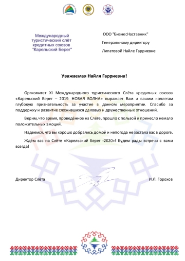 В июле 2019 года состоялся очередной турслет Кредитных потребительских кооперативов, в котором приняли участие генеральный директор ООО "БизнесНаставник" Найля Липатова и главный редактор журнала "Микрофинансовые организации: Учет. Надзор. Регшгулирование" Раиса Тарина.